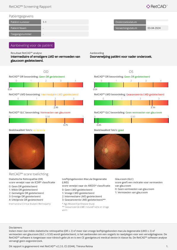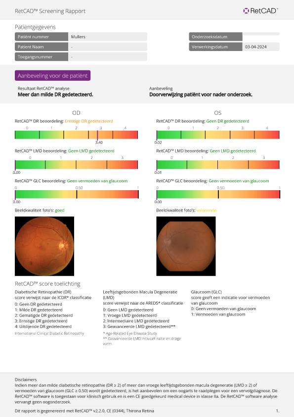 - Verwerking/analyse op de Thirona-servers met RetCAD AI. Dit duurt ongeveer 1 minuut